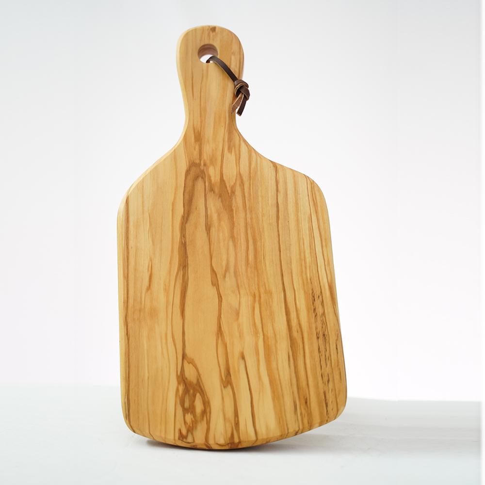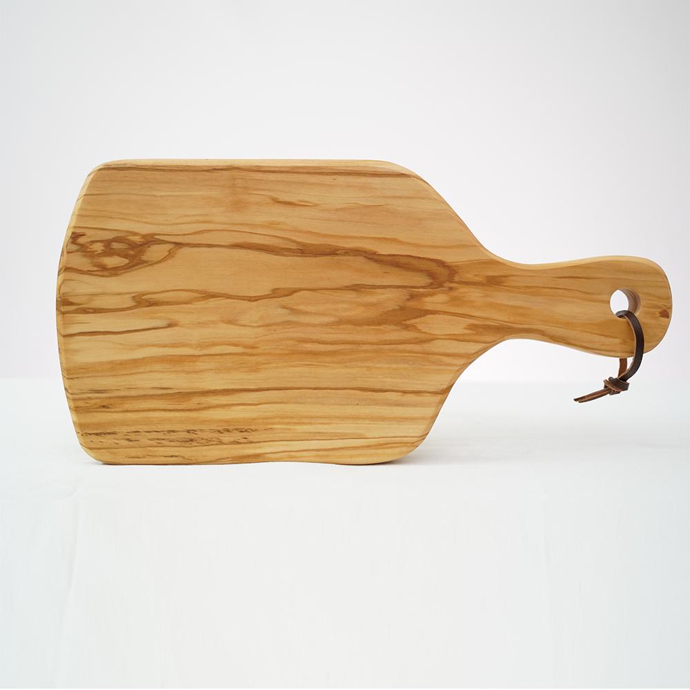 Olive wood cutting board, rectangular, with a handle. The all-purpose cutting or cheese board is great for every day chopping and presenting cheese displays.